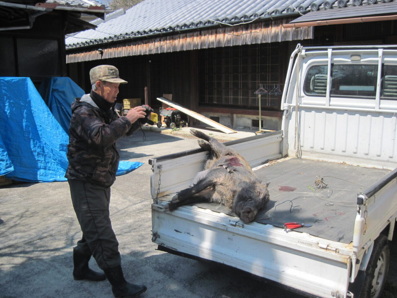 みかん畑で草刈りをしていると、隣の百姓のオッサンと猟師が、私の方に手を振って合図していました。