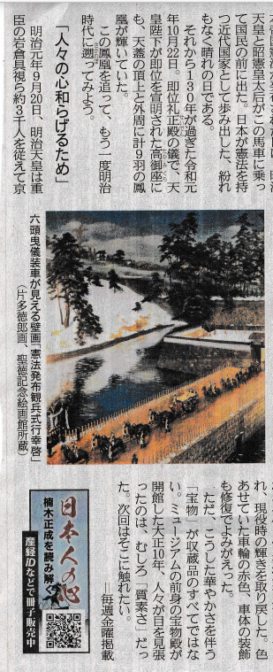 本当にこの馬車の御者をして、天皇を乗せて、東京を駆け抜けたんだろうか。さぞ得意になったことだろう。虎の威を借る狐、どころか、夢中だったに違いない。お堀端で転覆事故を起こした時も、皇后をお抱き奉ってお助けしたという。夢のような物語ではないか。